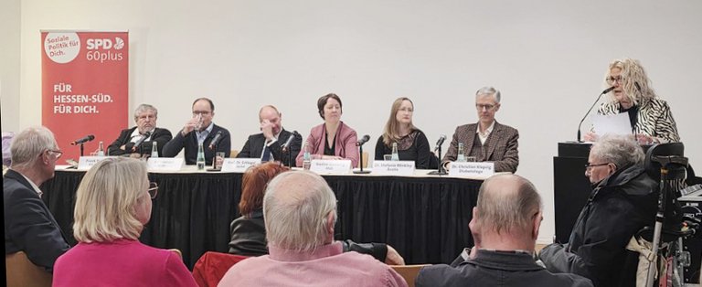 Monika Lehr-Horch, AG SPD 60 plus Vorsitzende und SPD UB-Vorsitzende Jutta Dahinten hatten perfekt vorbereitet: Plakat, Einladung, sechs fachlich hochkarätige Podiumsteilnehmer und eine Serie verschiedener Fragen mit dem Ziel, für die Situation im Kreis Offenbach zu sensibilisieren. Im Kreis Offenbach fehlen Ärzte. Die SPD kümmert sich. Die Moderation der Podiumsdiskussion in Dietzenbach, Kreis Offenbach am Mittwoch, 21. Januar 2026 übernahm Lothar Binding, Bundesvorsitzender der AG SPD 60 plus – sie hatte den freundlichen Titel: „Ärztliche Versorgung im Kreis Offenbach“.